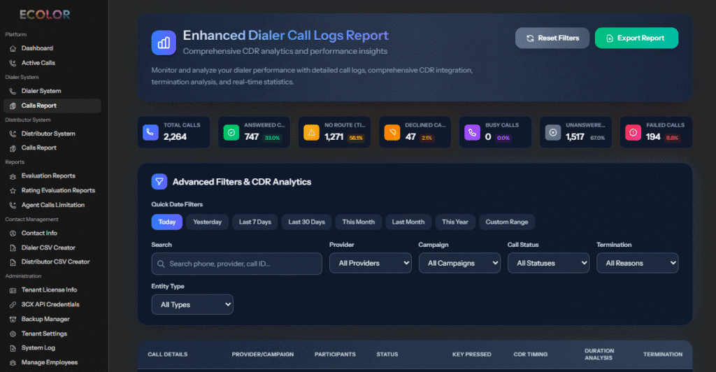 تقارير مفصلة وتحليل الأداء: يوفر تقارير آنية ودقيقة تساعد على تحسين أداء فريق الاتصال.